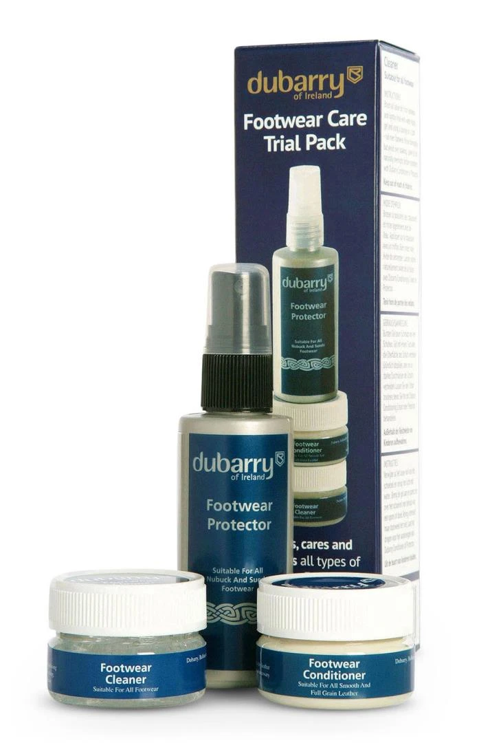 Dubarry Footwear Cleaner: Suitable for all types of footwear. Aids in the removal of dirt and other residues. Prepares leather for proofing and conditioning. Footwear Conditioner: Suitable for all smooth leathers. Restores a water repellent finish. Offers high stain resistance. Nubuck Protector: Protects footwear from the elements. Conditions and restores leather. Water-repellent.
