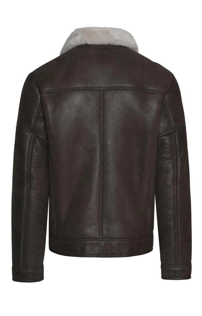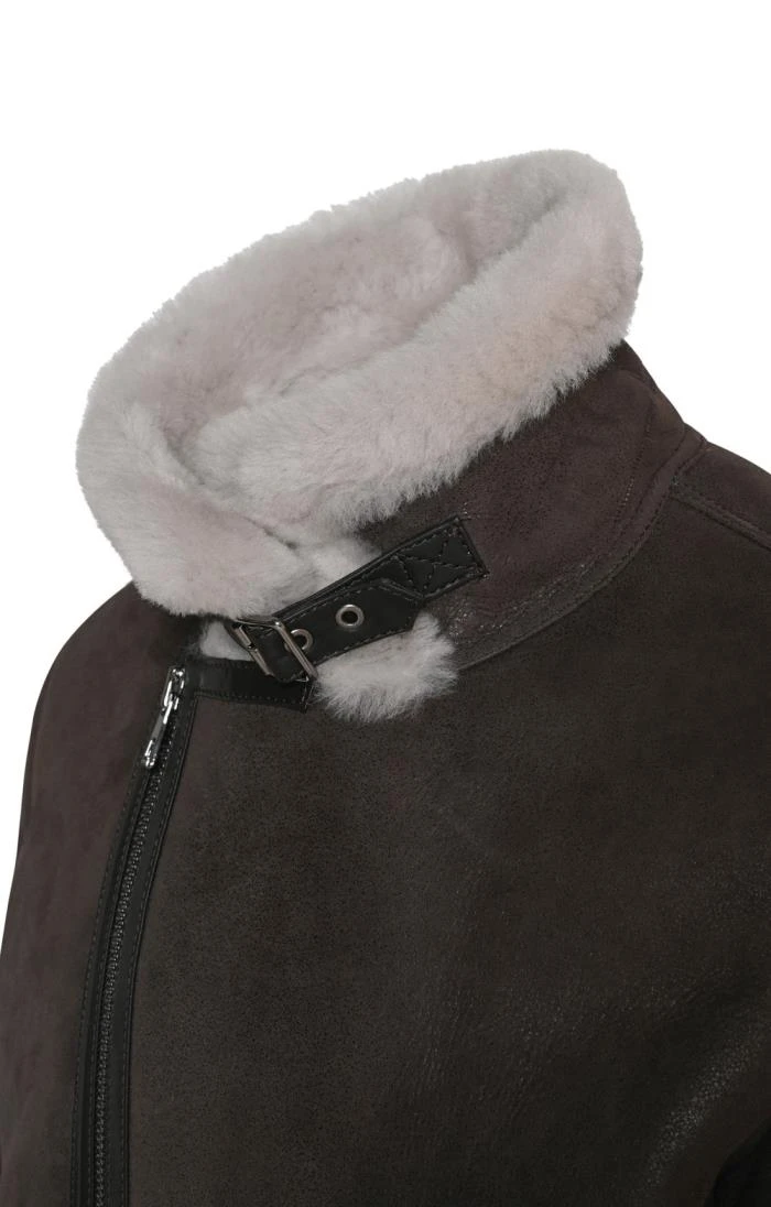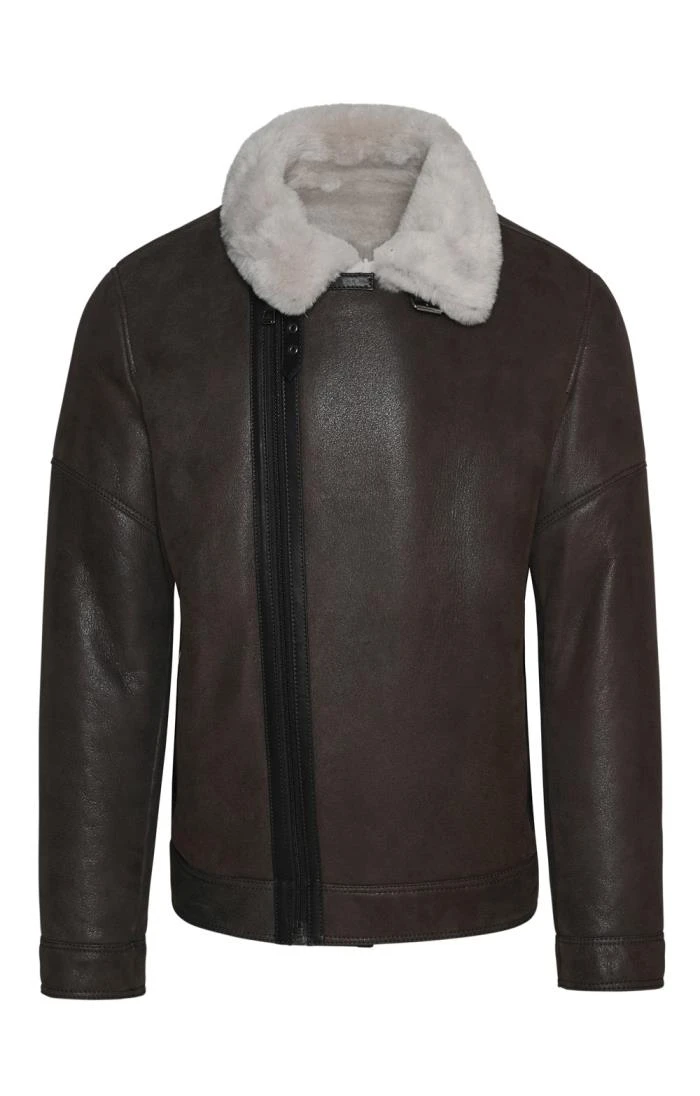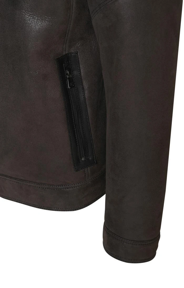 The Duke sheepskin jacket epitomises modern fashion with its relaxed cut and wide hem, offering a unique blend of style and comfort. The napped leather side adds a distinctive textured look, while the asymmetric two-way front zipper with leather trim, along with practical zip pockets on the sides, makes it a versatile choice for those on the go. The small fastenings at the collar ensure easy adjustment for various styles. Crafted from 100% sheepskin, this jacket features cut edges on the hem and sleeves for an extra touch of style and sophistication.