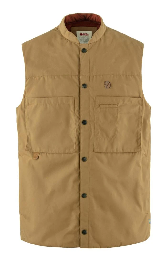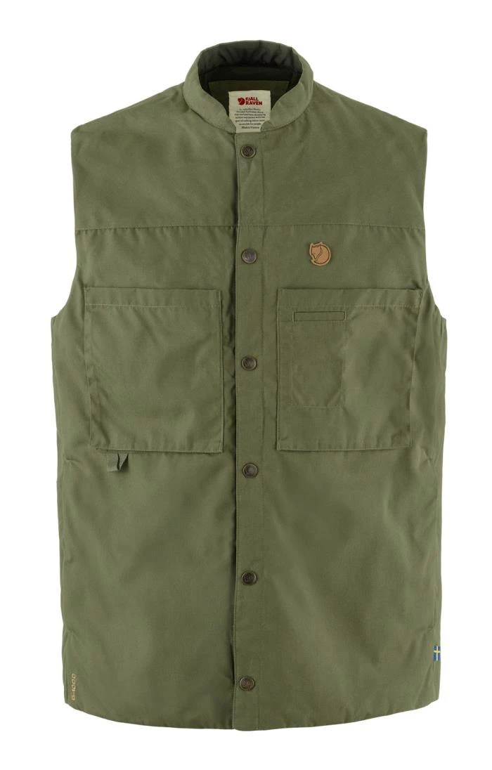 The hardwearing and functional Fjallraven Singi padded vest, designed with an emphasis on practicality, is your ideal companion for life on the move. Featuring two spacious bellows pockets thoughtfully placed lower on the chest for ease of access, an interior zippered chest pocket, a multi-tool pocket and two large hand pockets situated beneath the insulation layer to keep your hands cosy in cold conditions. Secured with press button closures at the front, it offers a relaxed fit that allows for effortless layering over a sweater or jacket, providing additional warmth as needed. Crafted for durability and adaptability, this vest is compatible with Greenland Wax, offering a water-resistant and wind-resistant barrier while providing reliable insulation.