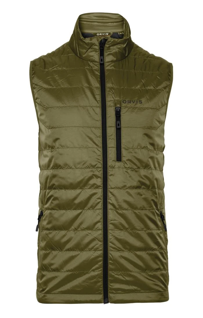 Lightweight, breathable and incredibly warm, the Recycled Drift Vest from Orvis delivers ultimate cosiness as temperatures begin to drop. The DWR shell is constructed from 100% recycled polyester in a hardwearing ripstop weave, while the insulation is comprised of 100% post-consumer recycled fibres. Even in wet conditions the Drift vest retains a high level of warmth while soft, tricot lined hand warmer pockets provide an extra line of defence from the cold. Stylish features such as a stand collar, chest pocket and chevron quilting give the Drift vest a modern edge.