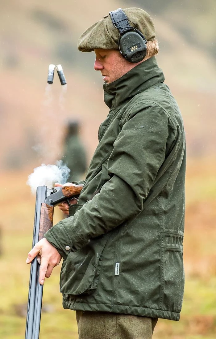 Schoffel’s Venturi 2 layer membrane.100% waterproof.Windproof.Highly breathable.Primaloft insulation.DWR finish (Durable Water Repellency).Two way stretch fabric.Bellow cartridge pockets with drainage holes.Retainer straps to keep cartridge pockets open.Micro fleece hand warming pockets.Internal zip security pockets.Removable recoil protection pad (optional left or right shoulder).Two way YKK zip.Alcantara trim.Adjustable storm cuffs.Detachable hood.Machine washable.