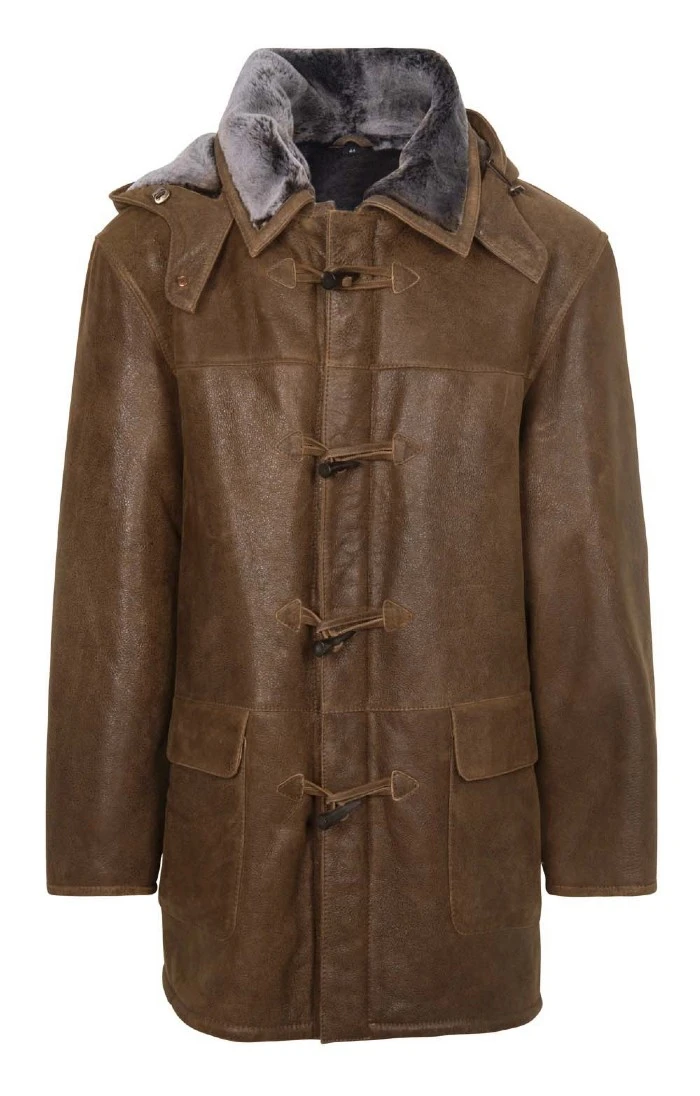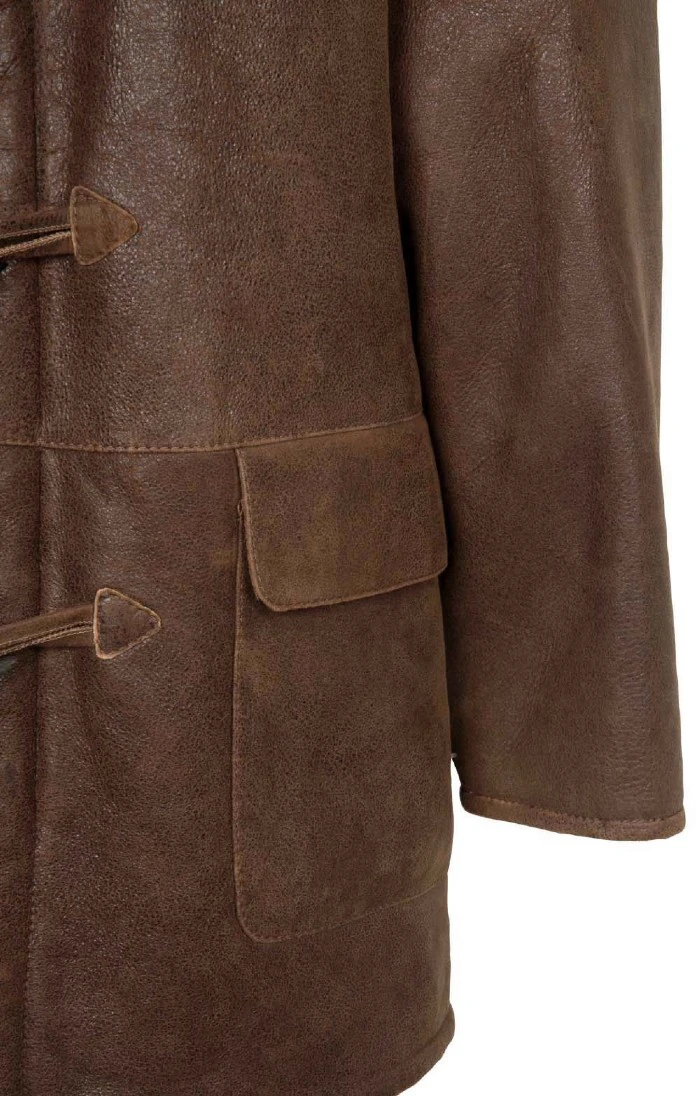 With its distressed leather grain outer, luxuriant 100% sheepskin lining and subtle retro styling, this sheepskin duffel coat will have you feeling warm and looking great whatever the weather has up its sleeve. Its loose fitting construction is ideal for layering over winter woollies, the toggle fastenings are enhanced with an internal zip for added protection and external and internal pockets keep essentials close to hand and hands cosy. Topped off with a detachable sheepskin hood, this investment jacket is the perfect pitch side partner or dog walk companion for active chaps.
