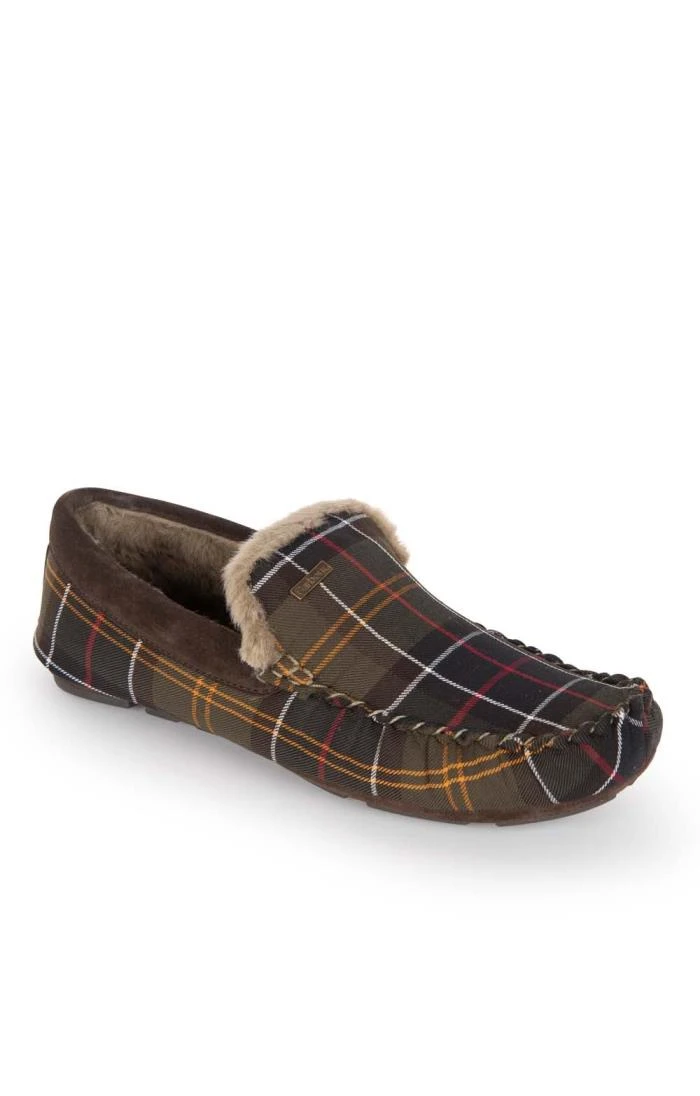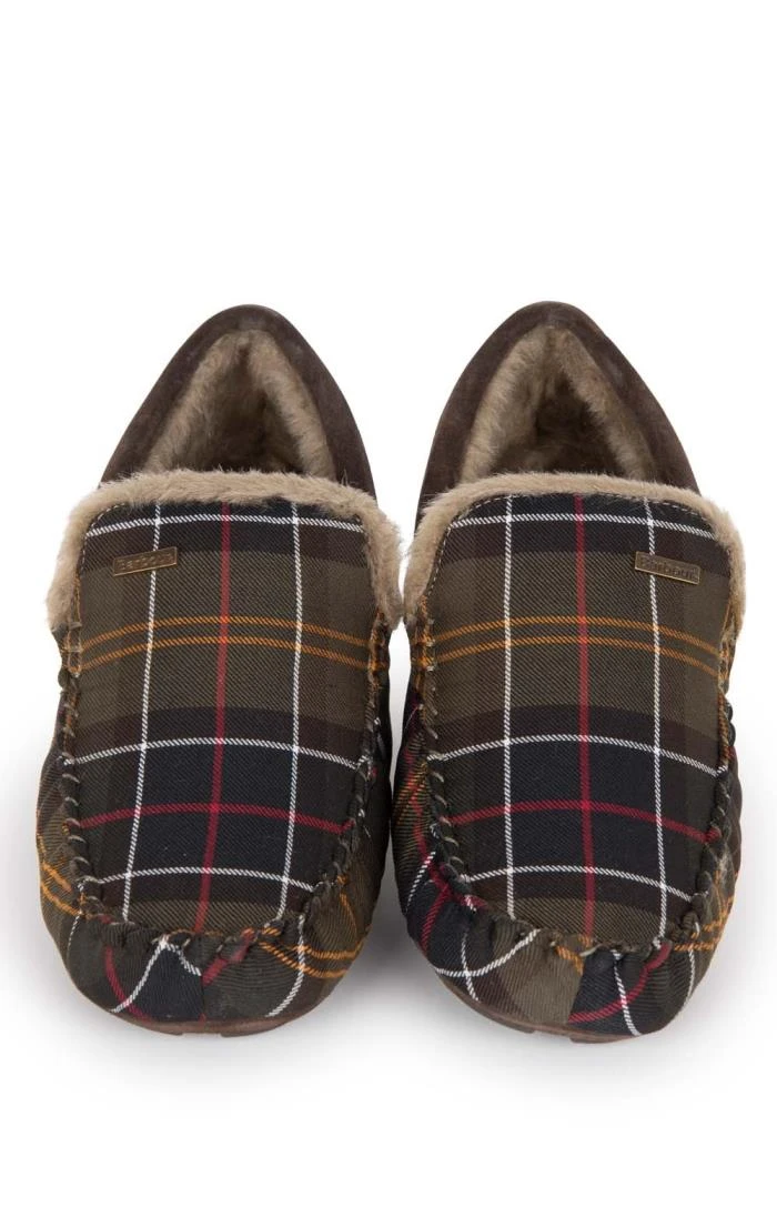 A moccasin faux shearling lined slipper. Classic tartan trim collar and hard wearing Barbour branded sole. Metal Barbour badge branding.